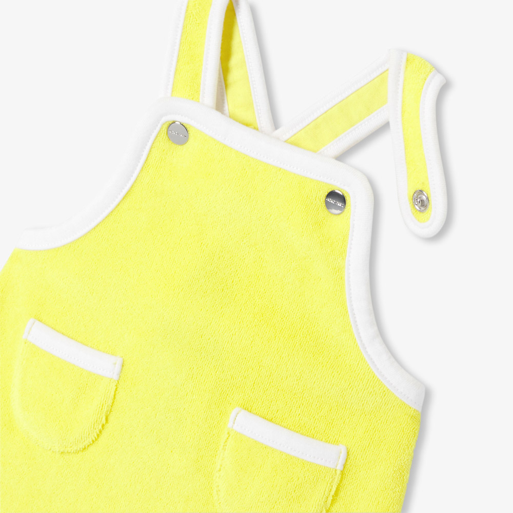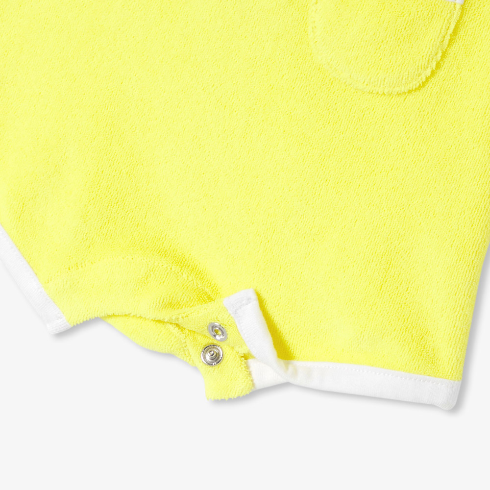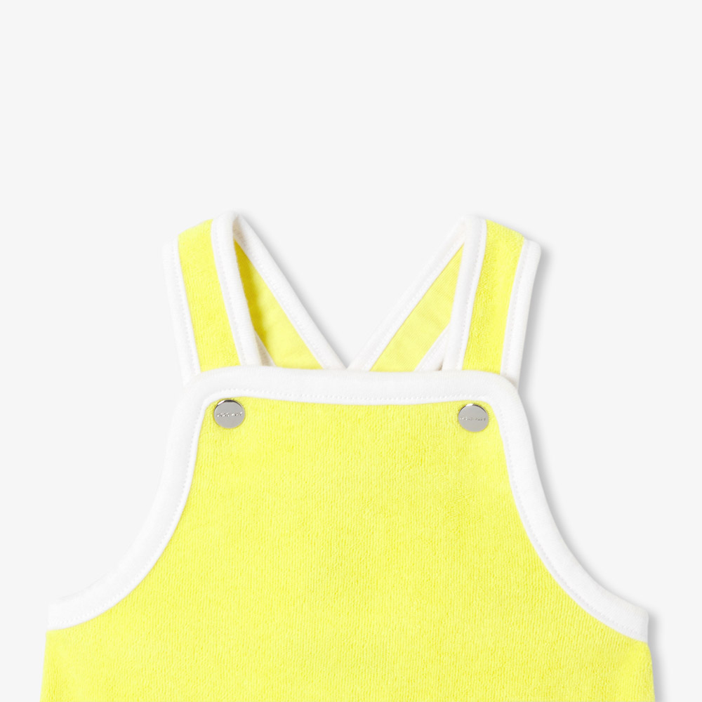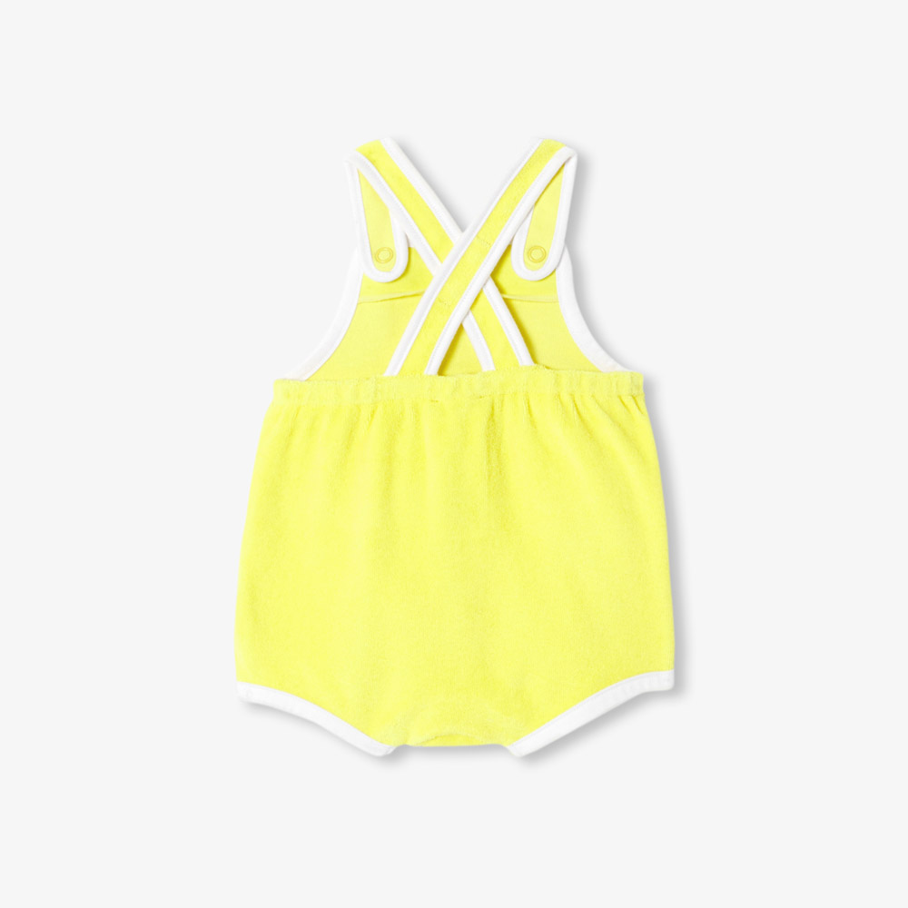L’esprit riviera s’empare du vestiaire estival avec cette barboteuse bébé en coton éponge. Surlignée de biais contrastés et de poches plaquées, coloris jaune solaire et bretelles croisées au dos signent cette pièce rétro. Facile à enfiler, balade en famille et première plage, elle sera de toutes les sorties.