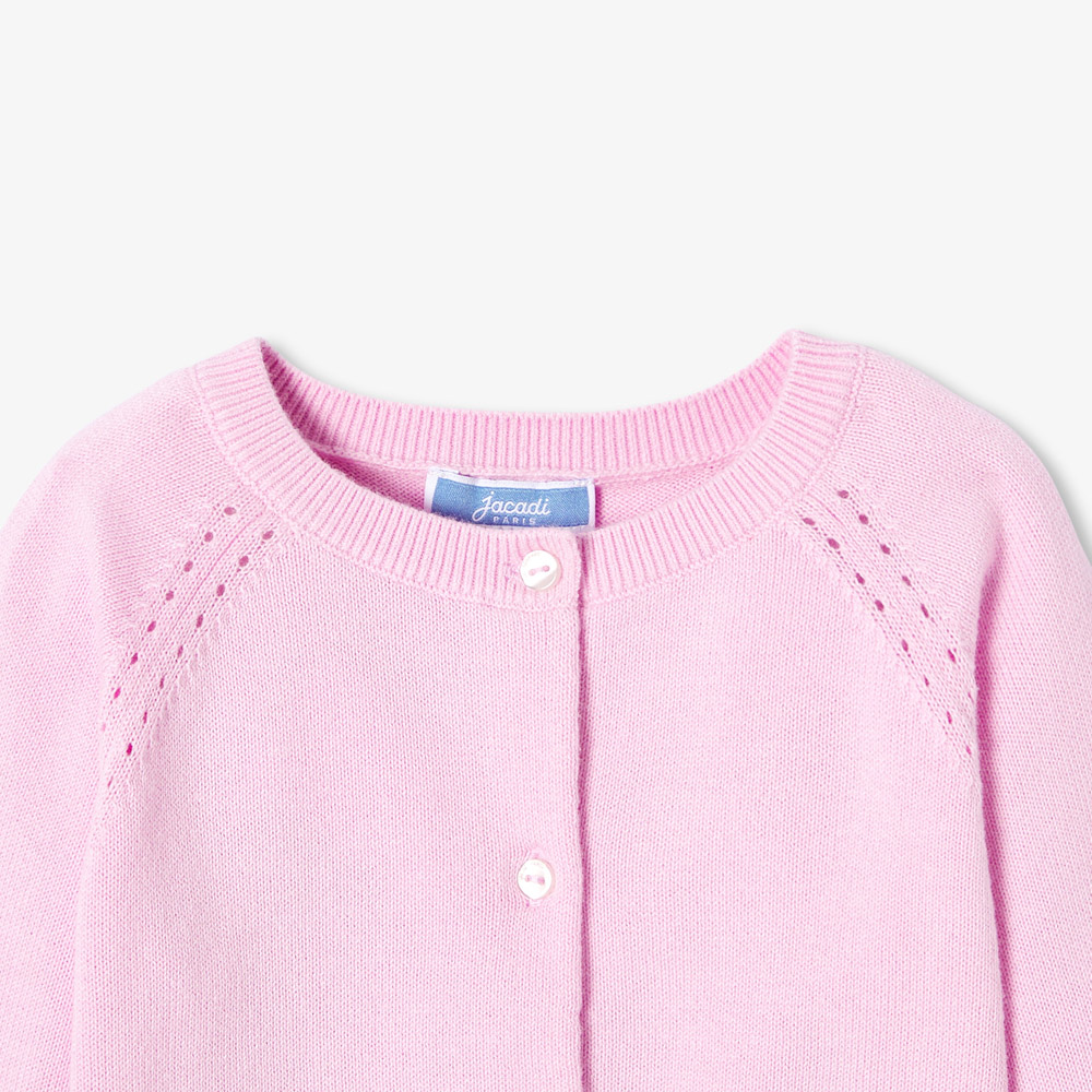 Doux et confortable, le cardigan bébé fille en coton séduit pour ses détails de maille pointelle aux emmanchures. Rouge vif ou lilas, il complètera avec élégance robe et combinaison dès le printemps.