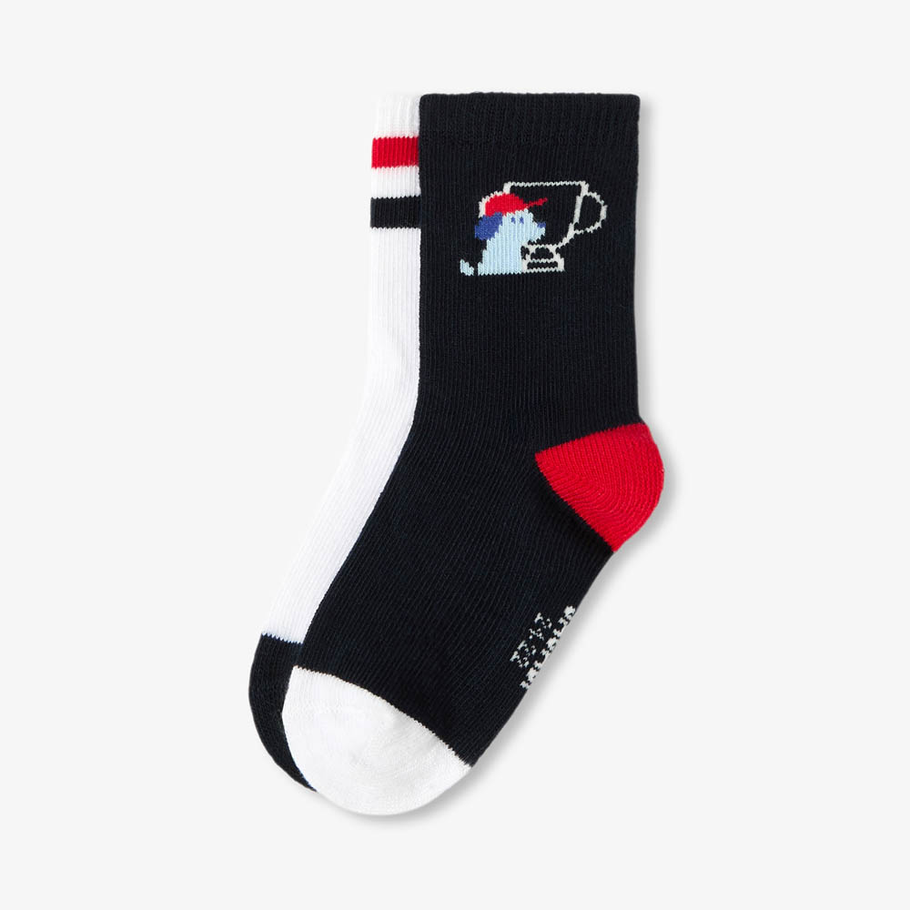 Un vestiaire french touch jusqu’à la pointe des pieds avec ces chaussettes bébé garçon. Tiges rayées pour les unes, animées d’un chien en intarsia pour les autres, elles finaliseront toutes les tenues du quotidien.