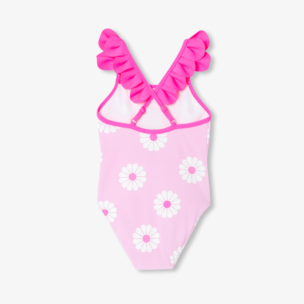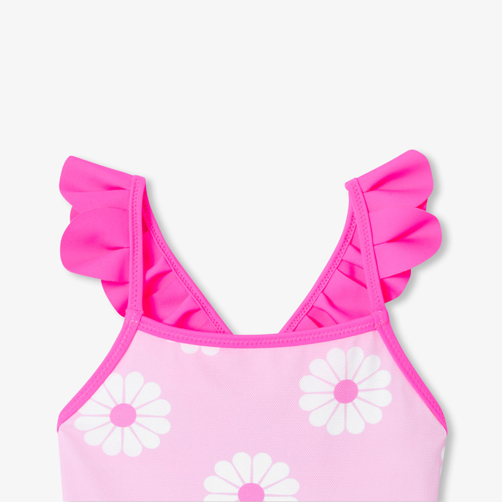Pour les baignades et concours de châteaux de sable à venir, ce maillot de bain fille répondra à toutes les activités. En maille piquée souple imprimée de pâquerettes, de ravissantes bretelles pétales rose fluo structurent ce modèle inédit à glisser dans la valise pour les vacances.
