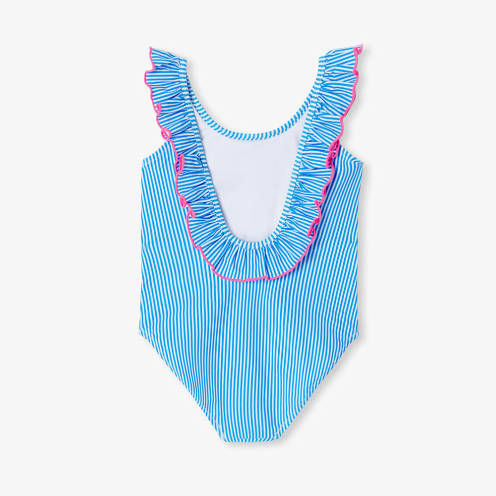 Sens du détail et finitions soignées, le maillot de bain 1 pièce enfant fille déploie tout son chic pour l’été. Rayée, l’empiècement volanté à point bourdon apporte un supplément de style à ce modèle à porter avec une capeline et des lunettes de soleil pour les futures vacances.