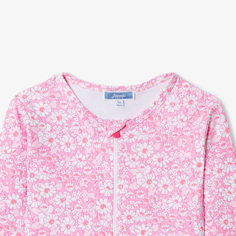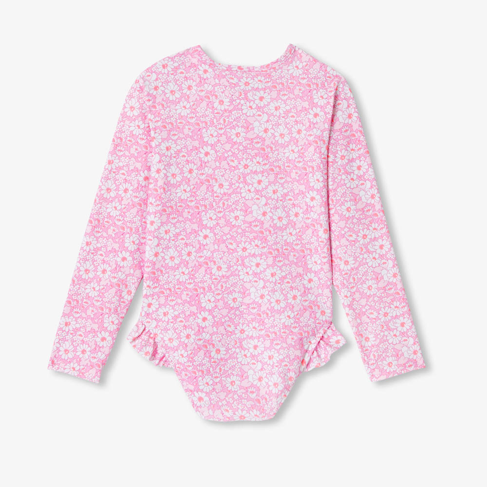 Cette saison, le maillot de bain fille s’habille d’un tissu Liberty foisonnant à la couleur vibrante. Manches longues et zippé à l’encolure, des empiècements volantés subliment ce maillot de bain esprit combi à porter avec une capeline et des lunettes.