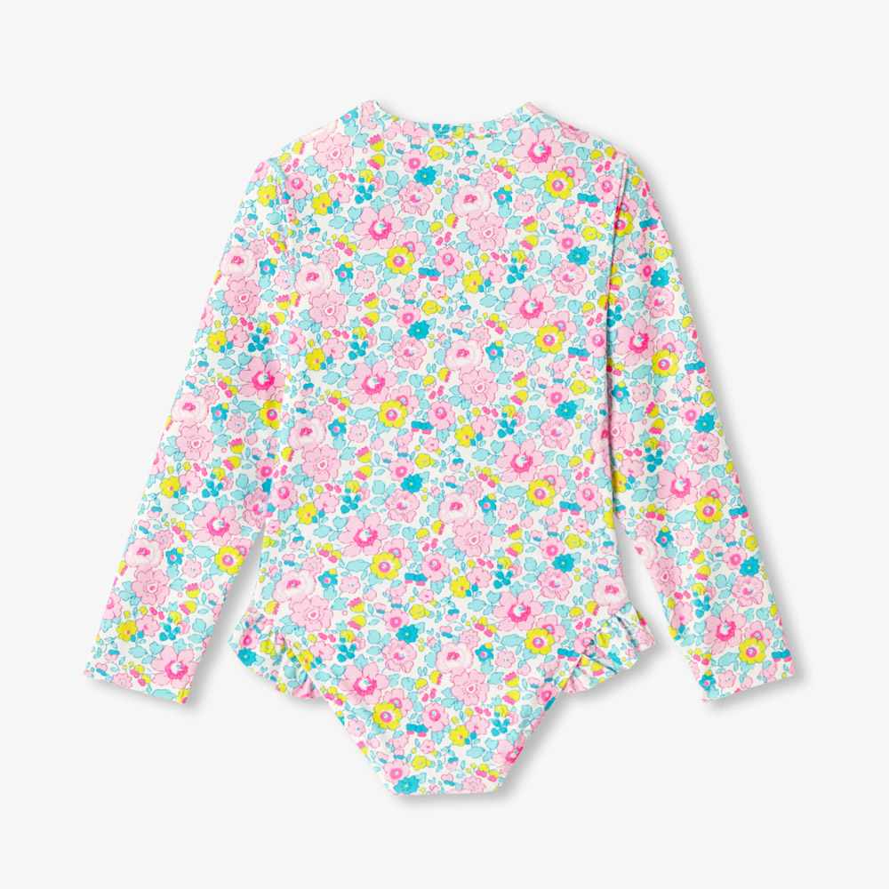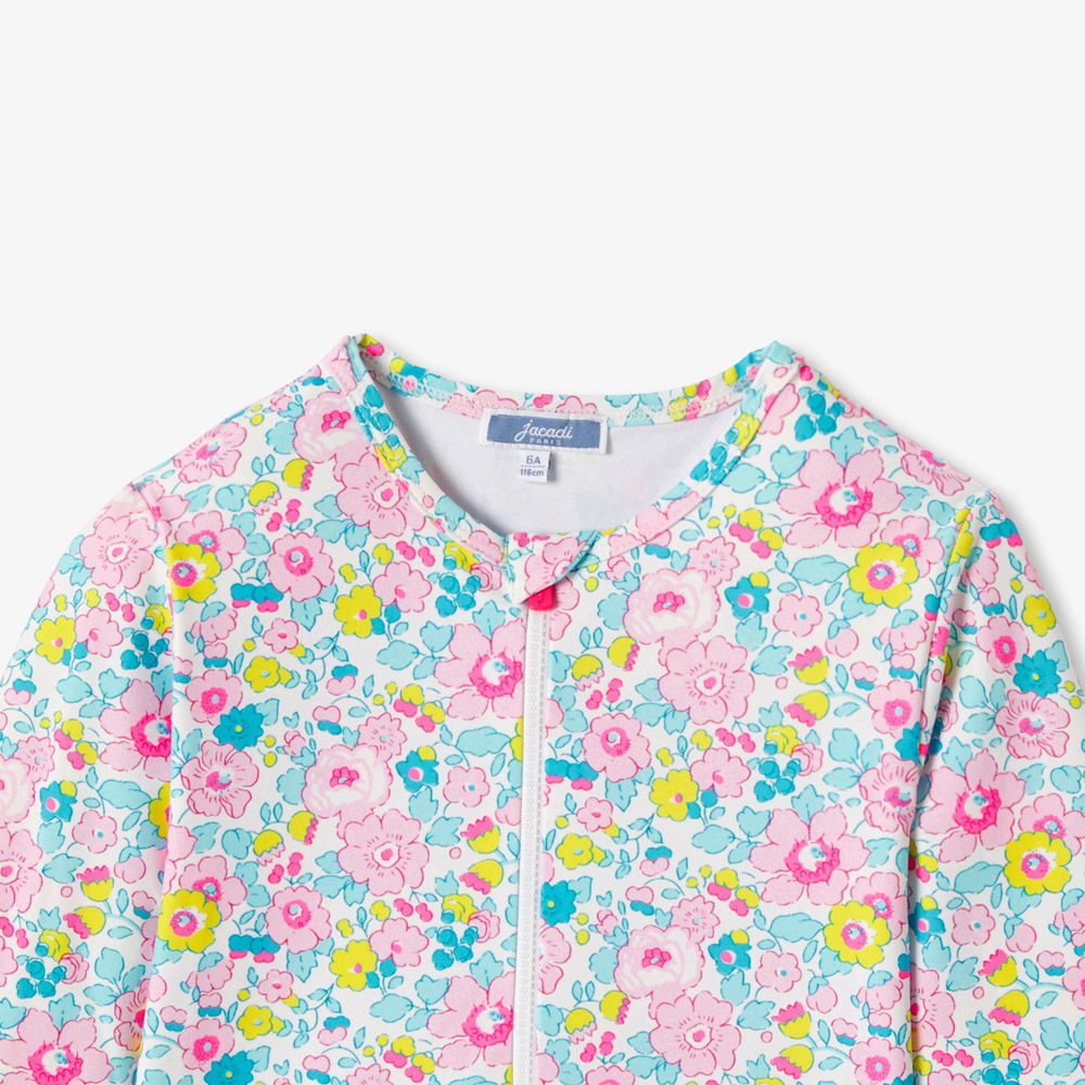 Cette saison, le maillot de bain fille s’habille d’un tissu Liberty foisonnant à la couleur vibrante. Manches longues et zippé à l’encolure, des empiècements volantés subliment ce maillot de bain esprit combi à porter avec une capeline et des lunettes.