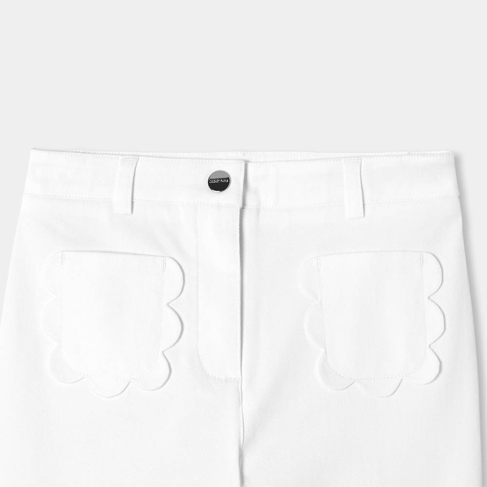 Adoré et adopté de toutes, le pantalon large en twill fille gagne en originalité avec ses poches plaquées festonnées. Toujours aussi confortable et versatile, il opte pour un coloris blanc pour le printemps. Un essentiel à offrir et à porter sans modération.