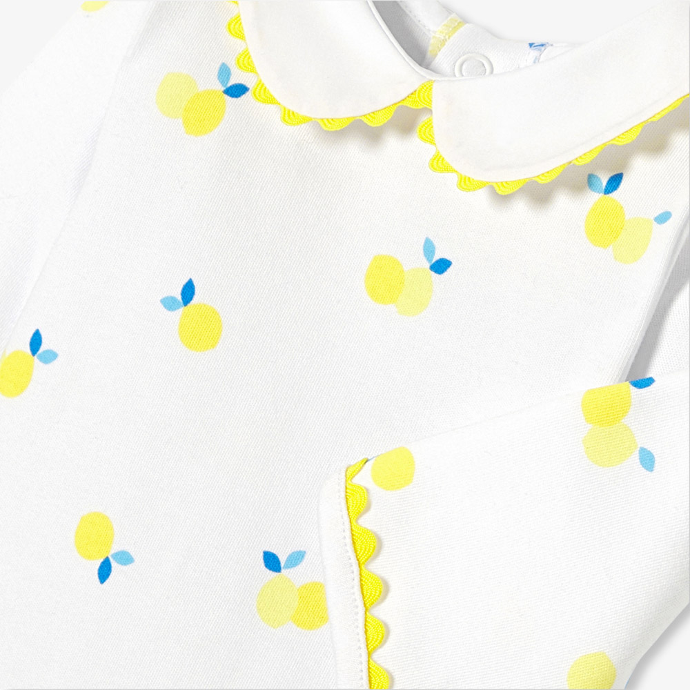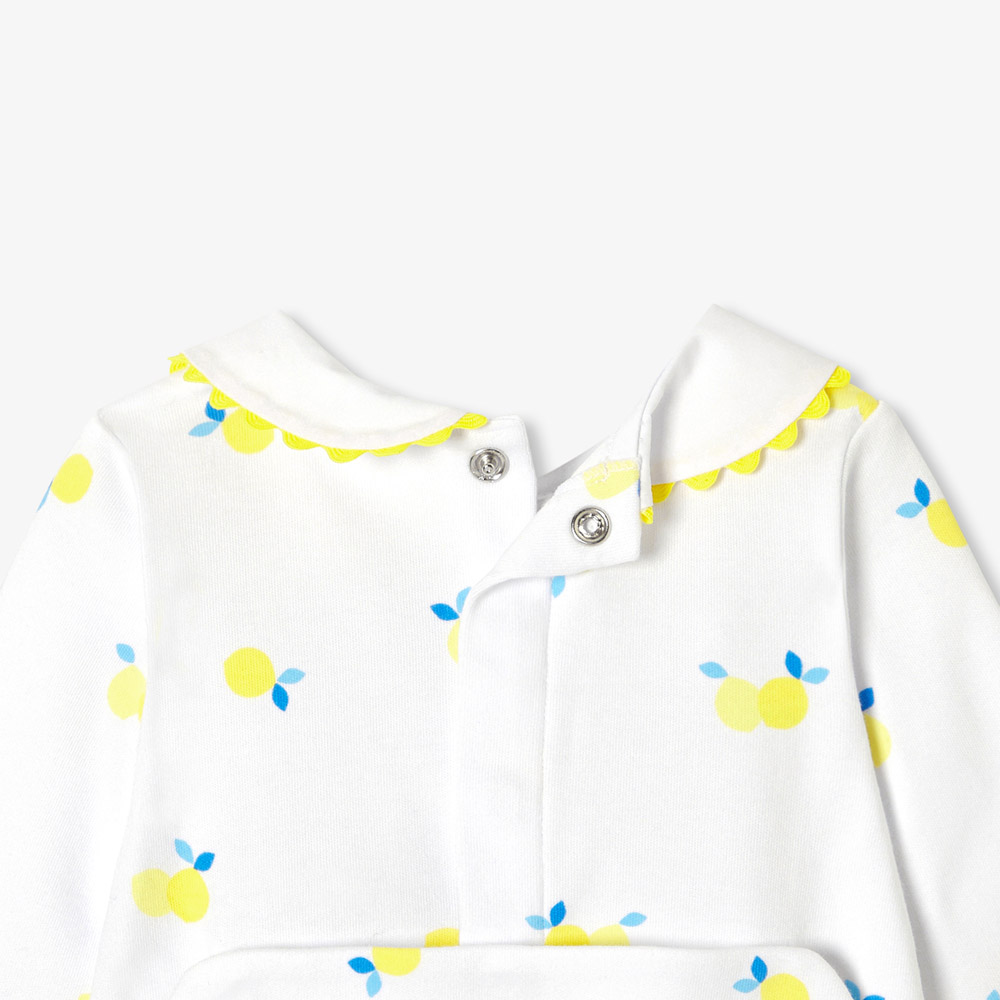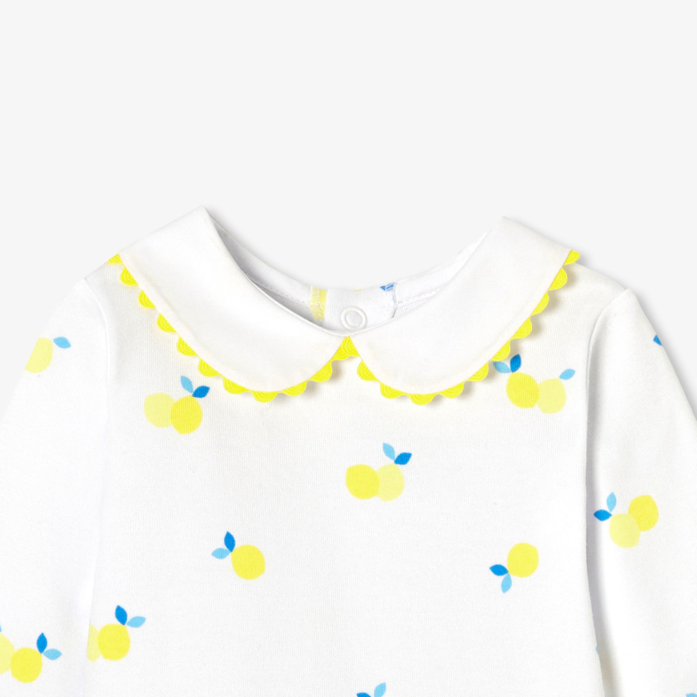 Frais et vitaminé, cet été, le pyjama bébé fille opte pour un zeste de fantaisie avec son irrésistible motif citron. Confectionné en coton biologique souple et très doux, col Claudine et détail de croquet finalisent cet indispensable du vestiaire de nuit.