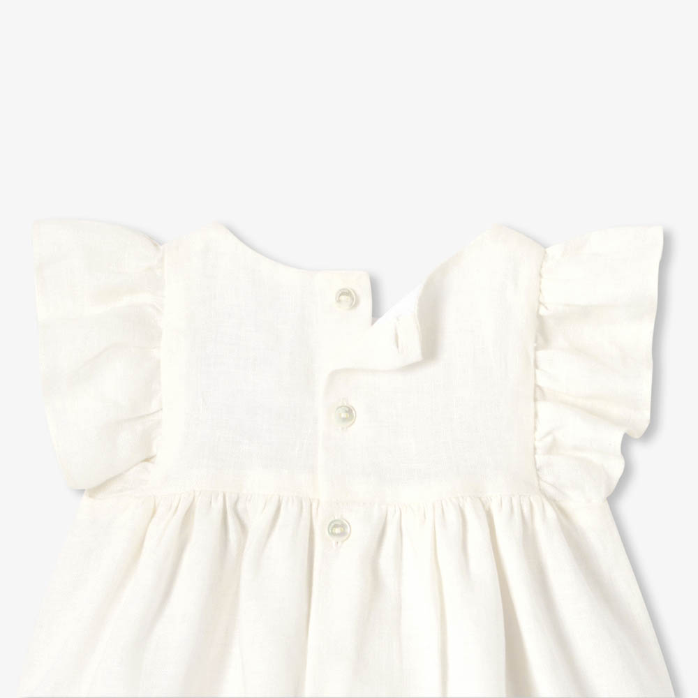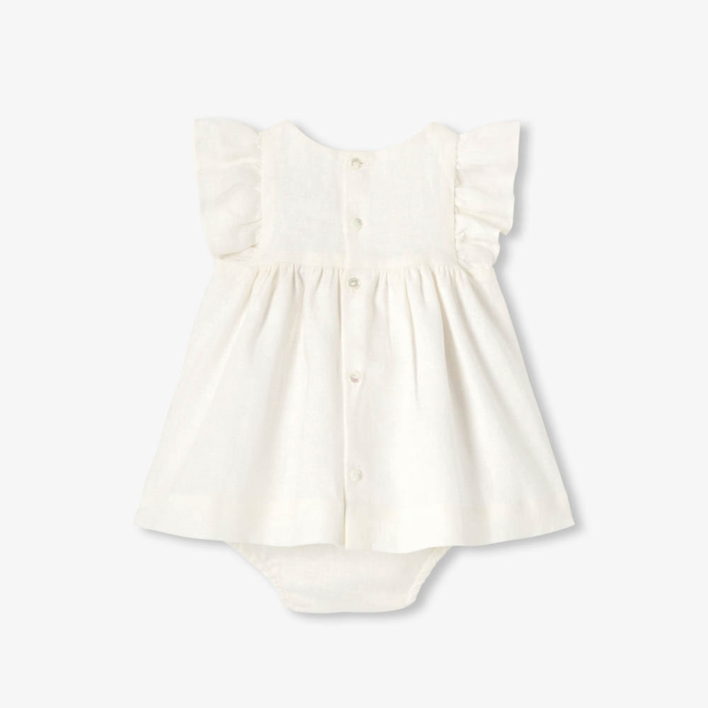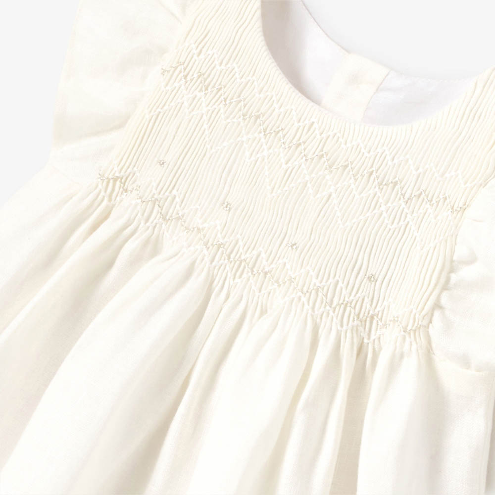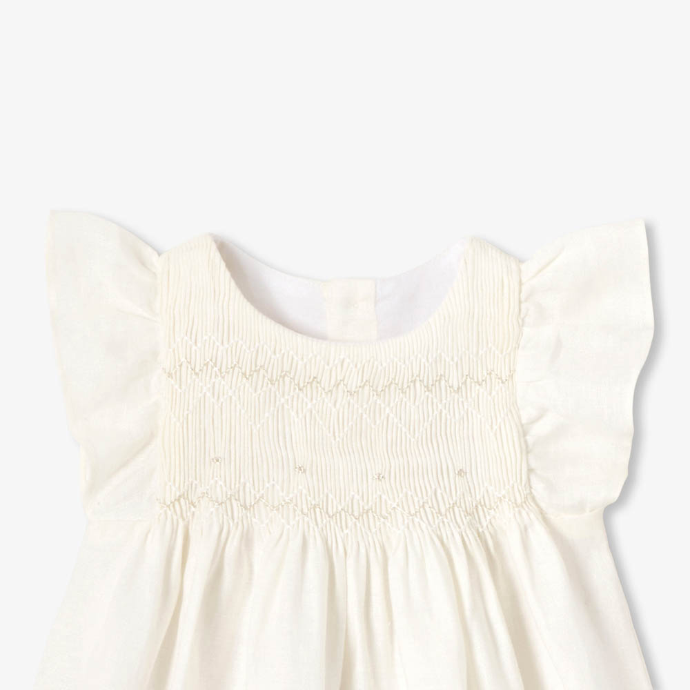 Incarnant l’élégance des beaux jours, cette robe bébé fille en lin naturel répondra à toutes les invitations. Sublimée d’emmanchures volantées et de smocks blancs et argentés rebrodés main, cette création illustrant le savoir-faire Jacadi est doublée en voile de coton doux et léger. Une robe alliant style et authenticité, parfaite pour un cadeau de naissance ou une cérémonie.