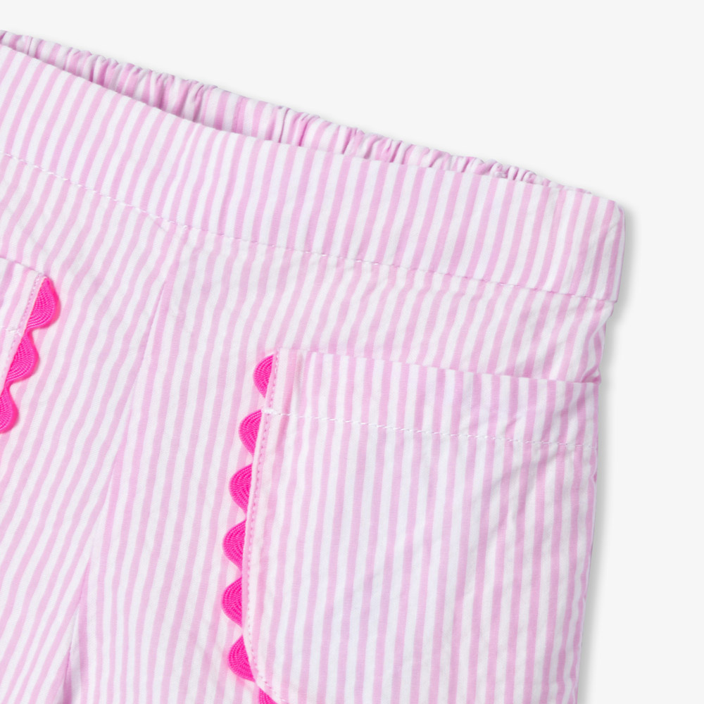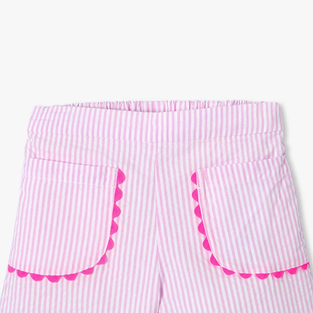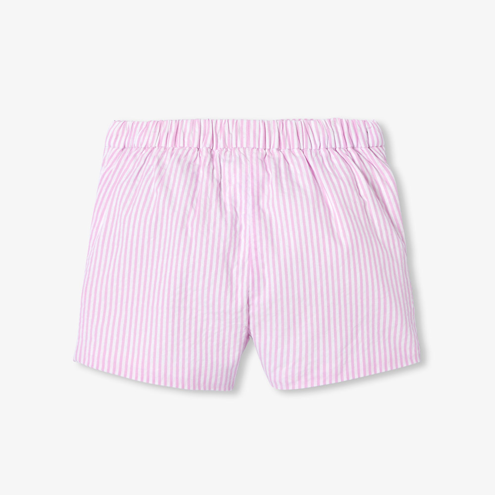Avec son coton doux et ses rayures bâton, les stylistes offrent une version chic et estivale du short bébé fille. Orné de larges poches plaquées contourées d’un croquet rose pour un look rétro, t-shirt manches courtes ou body s’accorderont joliment à cet indispensable de l’été.