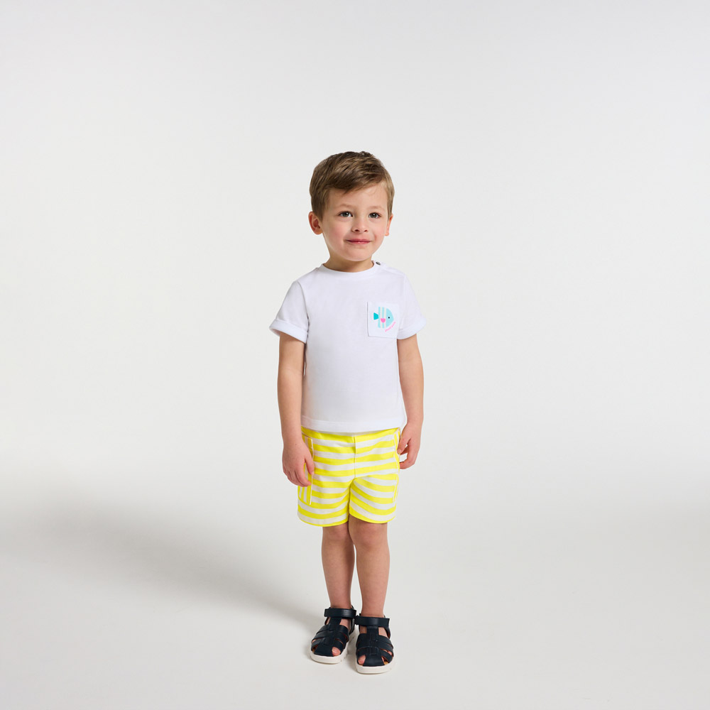 Alternative graphique au bermuda uni, le short bébé garçon en twill de coton surfe sur la tendance rayée pour l’été. Blanc et jaune dynamisant, ce modèle contemporain à larges poches plaquées suivra bébé dans toutes ses découvertes estivales.