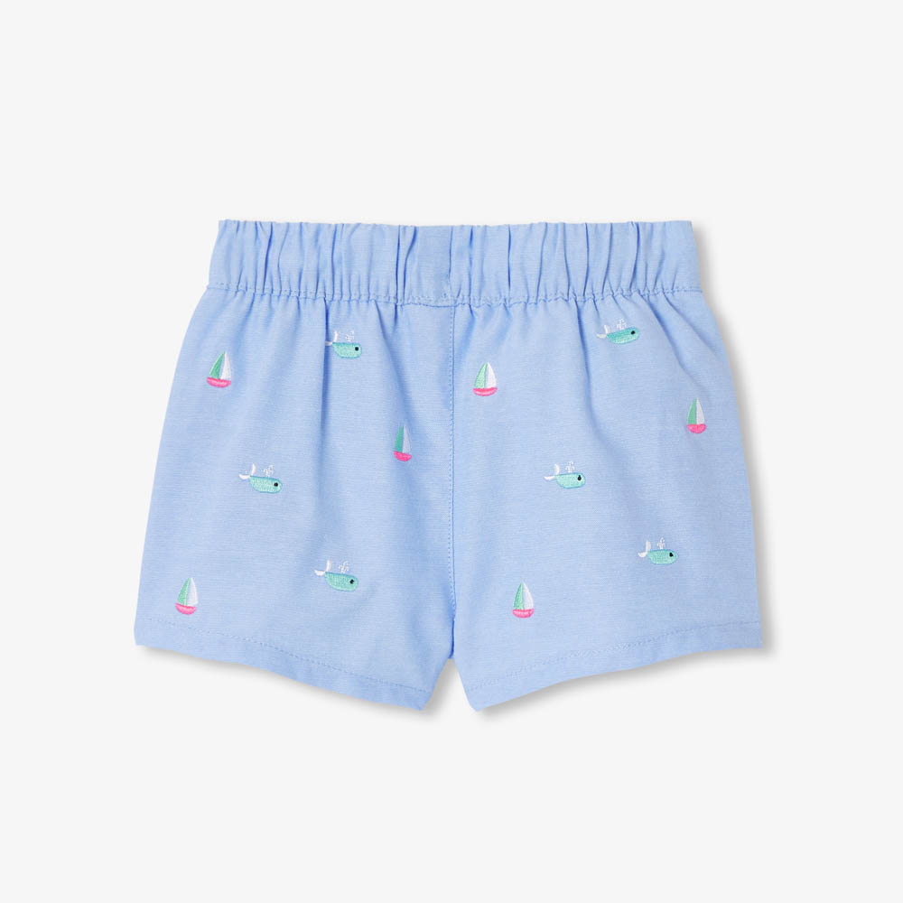Avec ses baleines et ses bateaux brodés sur un oxford bleu, ce short de bain bébé garçon sera de toutes les baignades. Parfait pour la piscine ou la plage, pensez à l’accorder à un bob.
