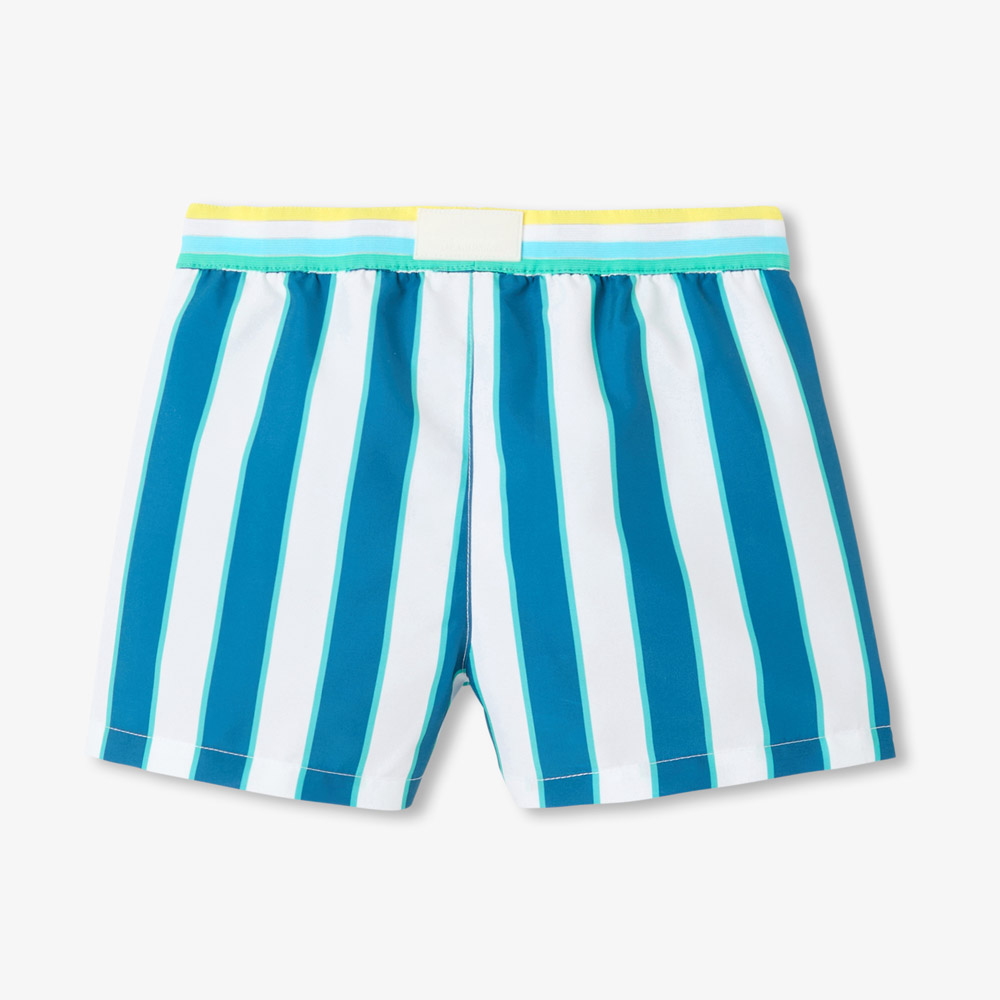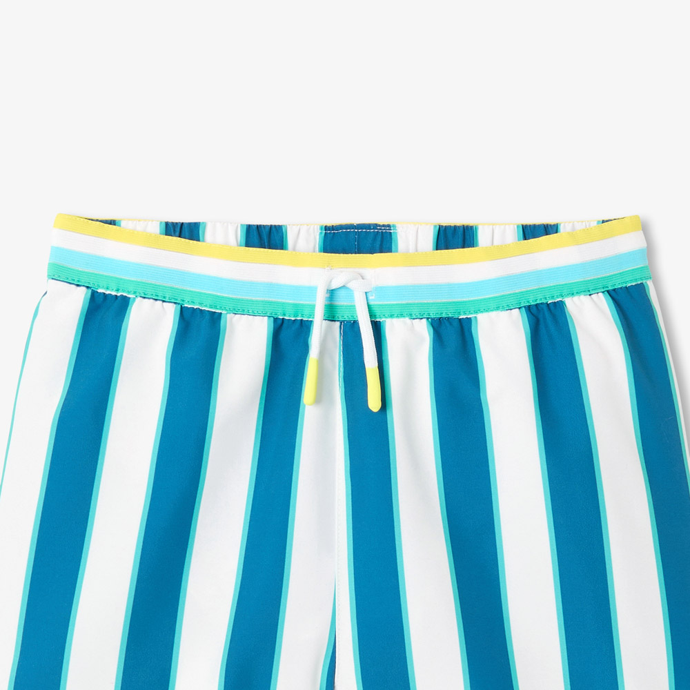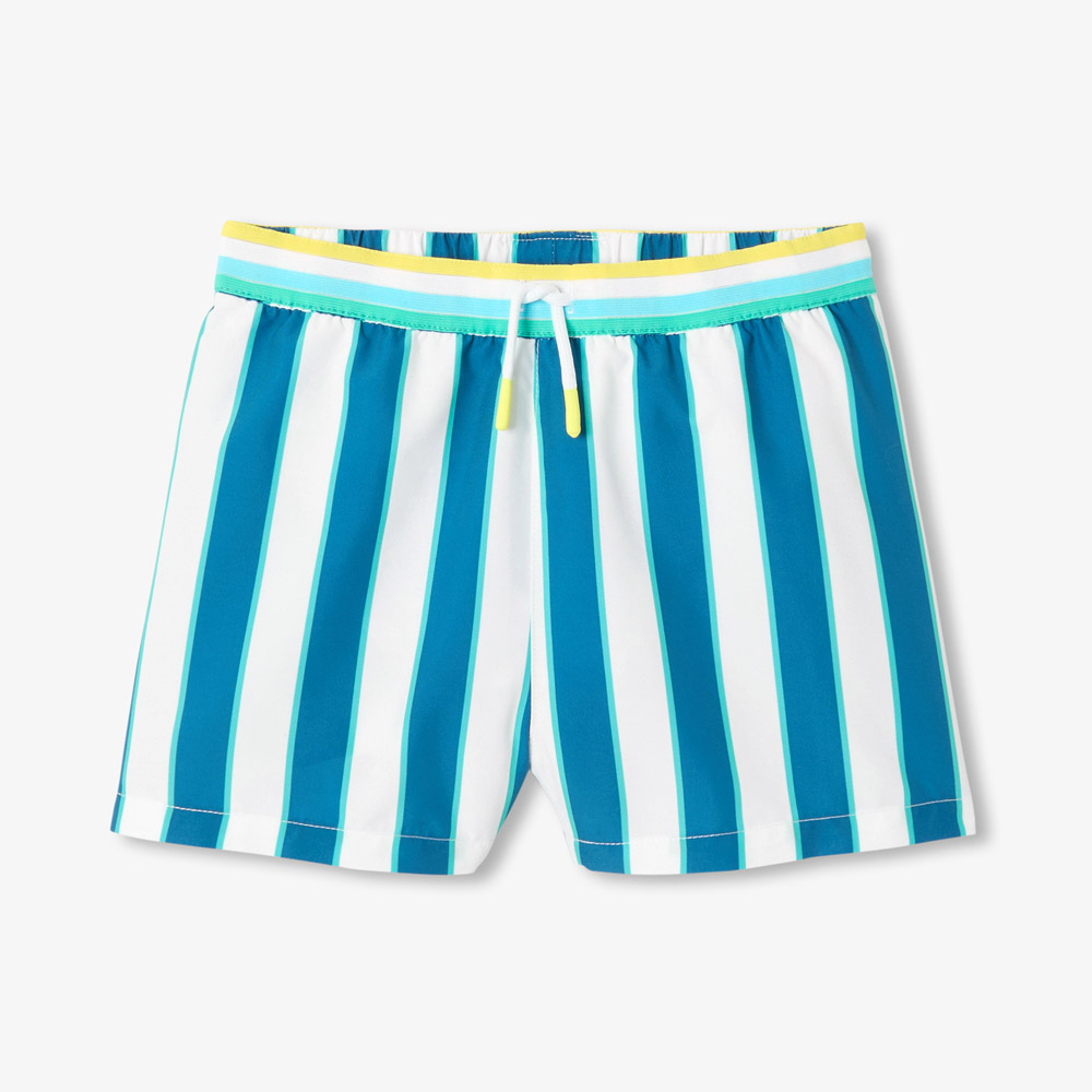 Rayé de bleu et blanc, le short de bain enfant promet un été graphique et tout confort. Taille élastiquée ajustable et doté d’un slip intégré, cet essentiel du vestiaire à porter avec un t-shirt anti-UV suivra votre garçon dans tous ses plongeons.