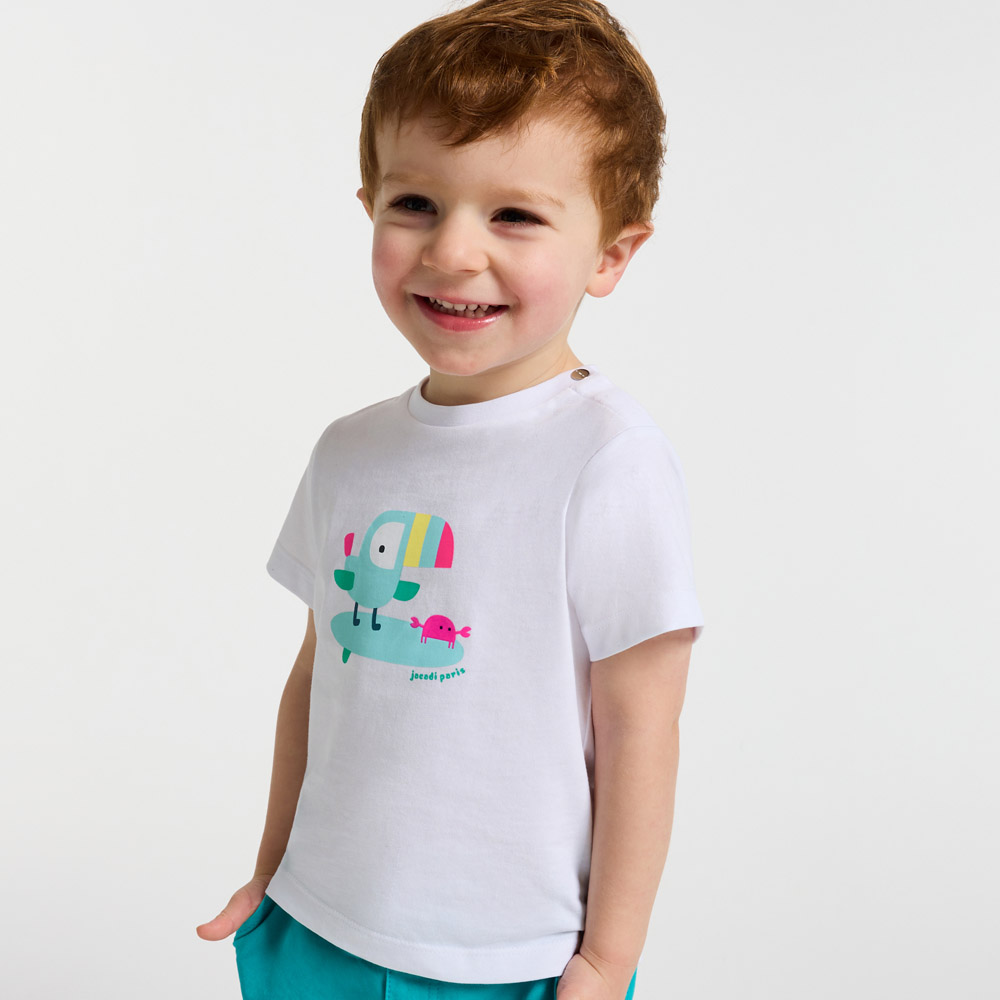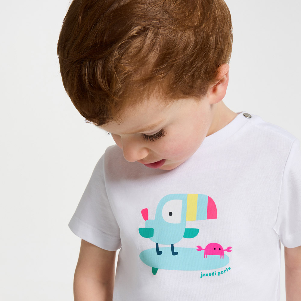 Taillé pour le plein été, le t-shirt bébé en coton blanc joue l’apprenti surfeur avec son toucan coloré. Un basique revisité qui apportera confort, style et fantaisie aux looks de saison.