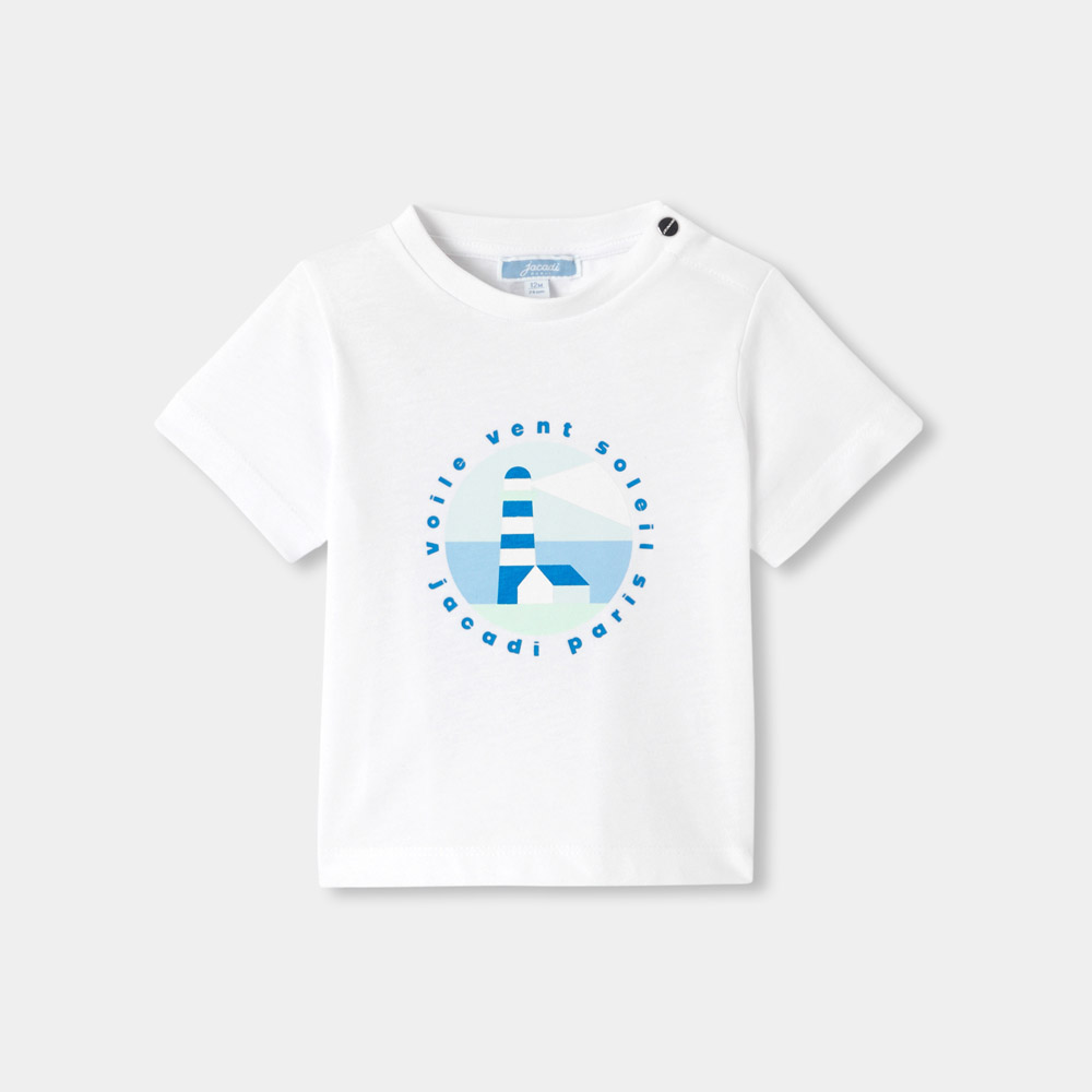 Basique revisité chaque saison, le t-shirt blanc bébé garçon célèbre l’arrivée de l’été. Animé d’un paysage marin avec un phare et une maison, il habillera les beaux jours avec confort et originalité.