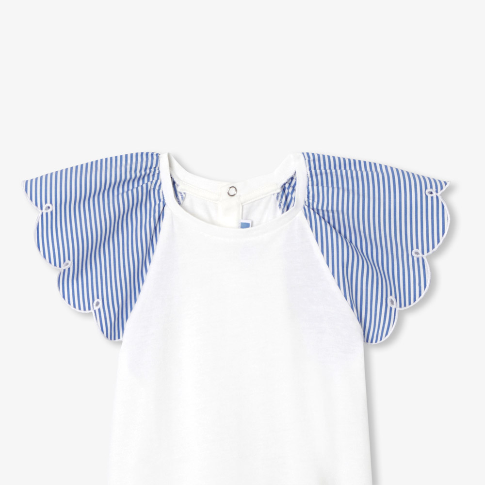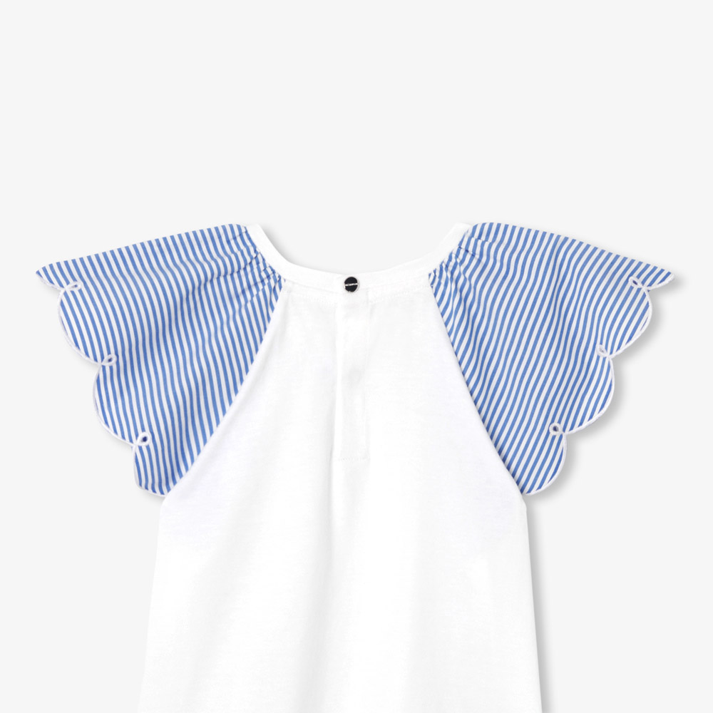 Confort d’un jersey de coton, élégance de manches festonnées en popeline rayée, le t-shirt enfant fille séduit pour son look bord de mer moderne. Porté avec un pantalon large imprimé ou un short en tissu Liberty pour mixer les imprimés, il se portera facilement du printemps à l’été.