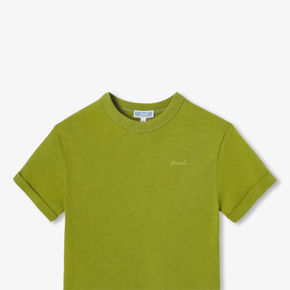 Jacadi signe une nouvelle interprétation du t-shirt en jersey enfant fille avec cette version boxy raccourcie. Doté de manches à revers et brodé sur la poitrine, le volume actuel de ce basique modernisé complétera aussi bien une jupe qu’un pantalon large.