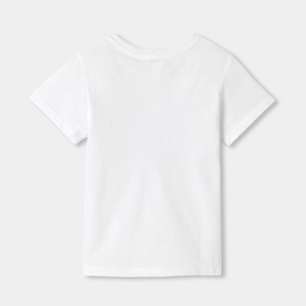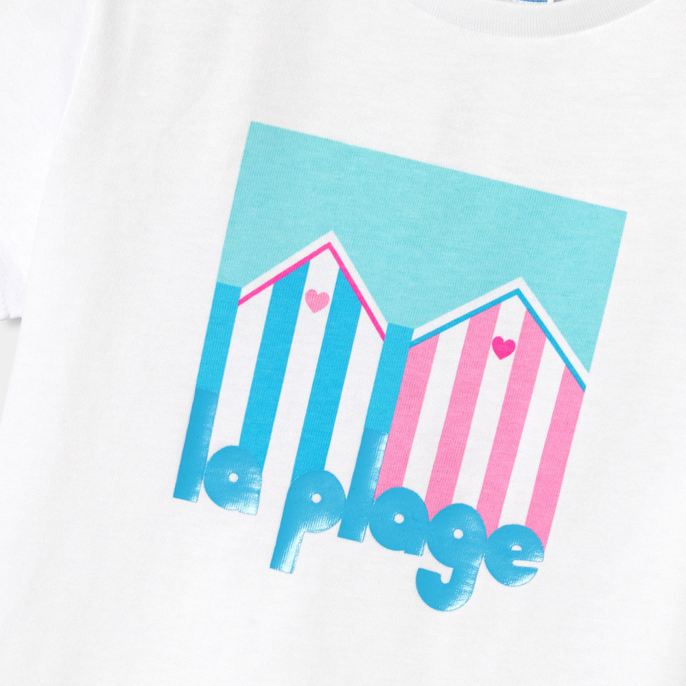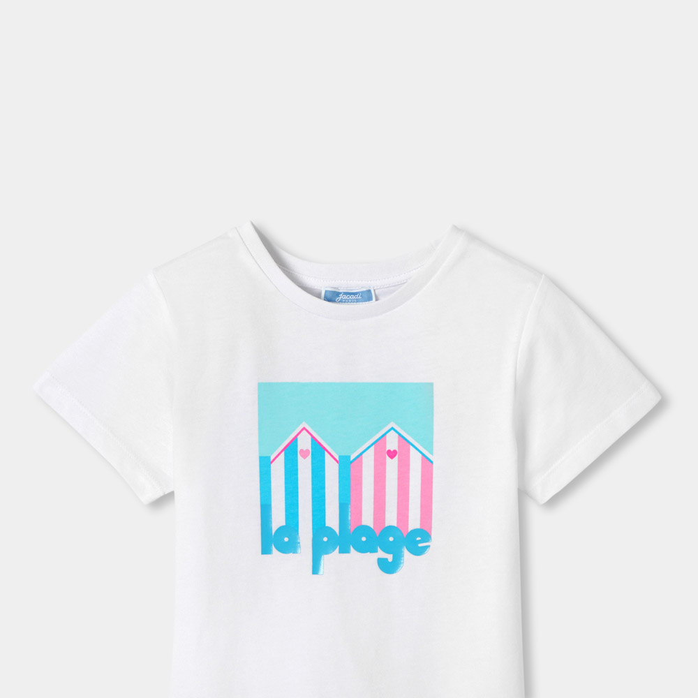 Clin d’œil aux étés passés au bord de l’eau, le t-shirt enfant fille en jersey de coton s’anime de cabines de plage stylisées. Doux et facile à enfiler, accordez-le à un short rayé à poches cœur.
