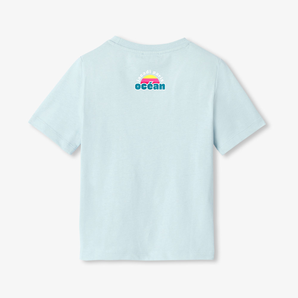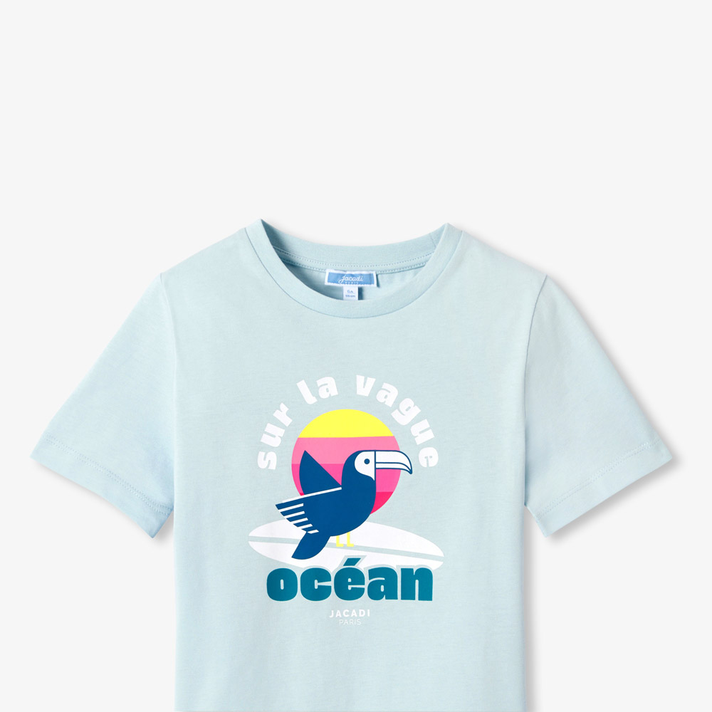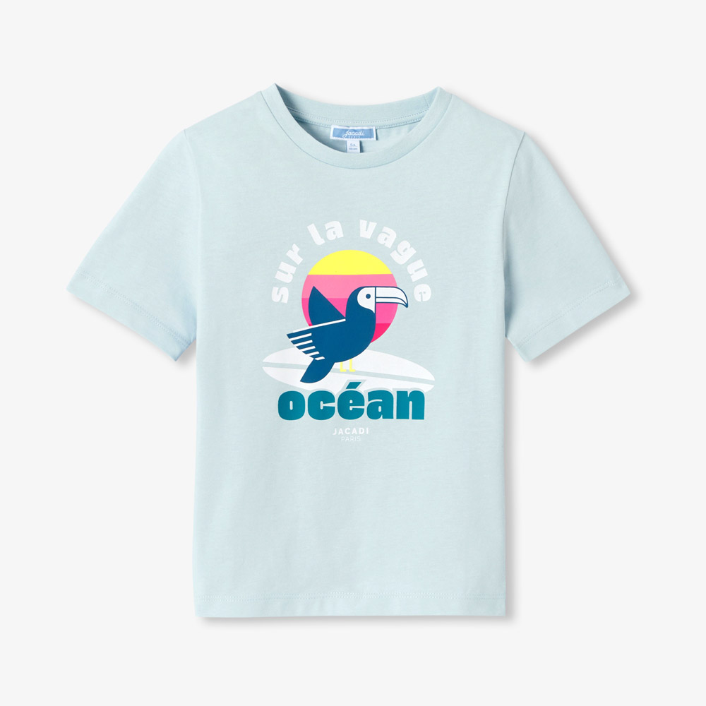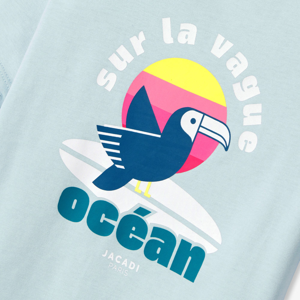 Classique du vestiaire modernisé d’un visuel estival, le t-shirt manches courtes garçon se transforme en un t-shirt à message joyeux et coloré. En jersey de coton léger animé d’un toucan surfeur, c’est le modèle parfait pour les après-midis au soleil et les vacances en famille.