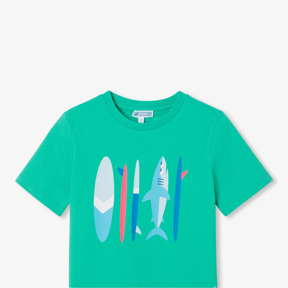 Basique du vestiaire estival, le t-shirt enfant garçon en jersey de coton se dirige vers l’océan pour s’initier au surf. Floqué de planches de surf et d’un requin espiègle, ce modèle taillé pour les vacances facile à porter avec un bermuda en toile ou en éponge, deviendra très vite son préféré.
